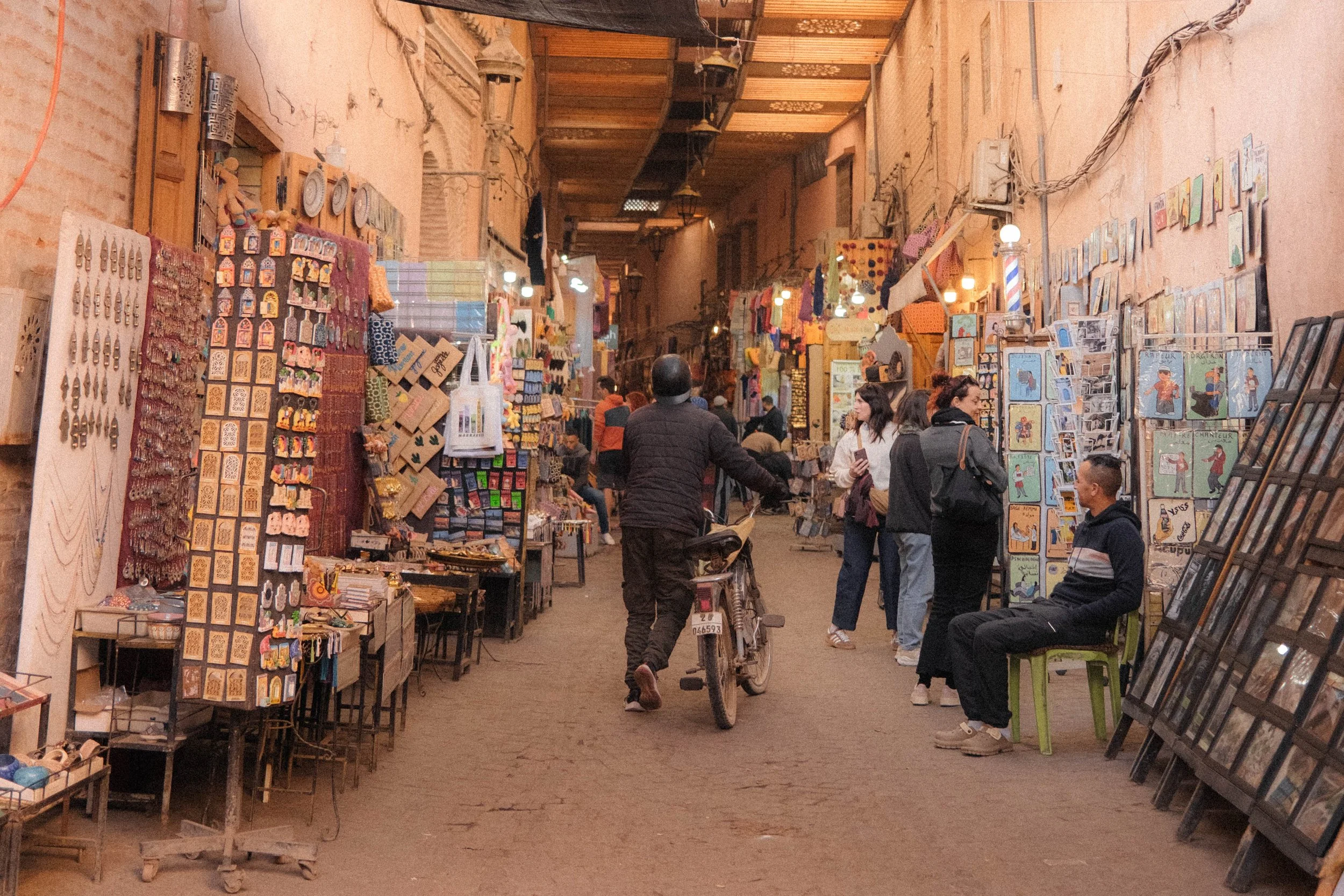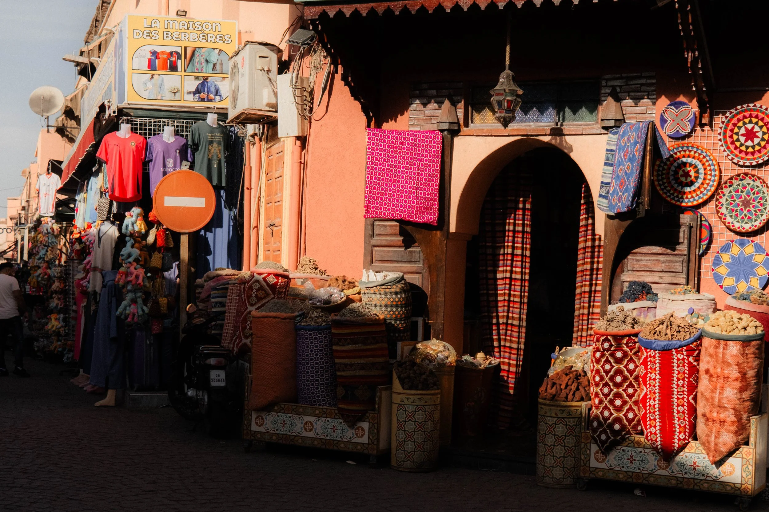 Explorar los zocos de la medina es una experiencia esencial en Marrakech. Esta zona histórica está conformada por un laberinto de estrechas callejuelas llenas de puestos donde puedes encontrar artesanía local, especias, tejidos, joyería y productos modernos. Cada sección de los zocos sigue conservando el nombre de los artículos que solían vender en el pasado.