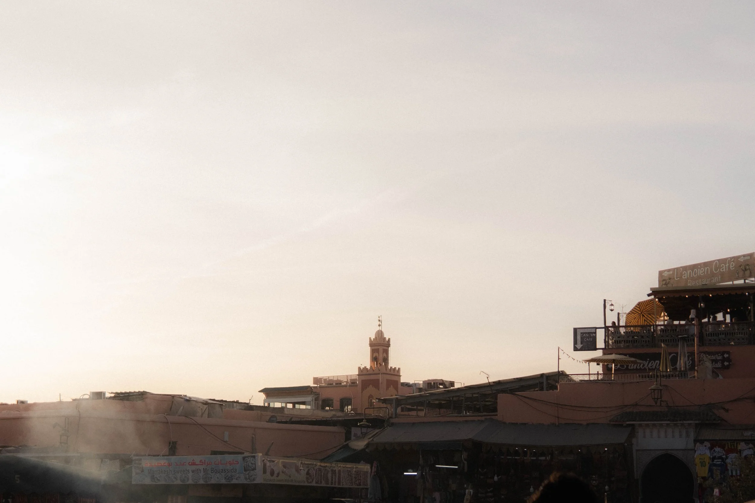 Desde sus terrazas se pueden obtener vistas panorámicas espectaculares de la plaza, especialmente al atardecer. Sin embargo, hay que tener precaución con los espectáculos con animales, como monos encadenados o serpientes, ya que en muchas ocasiones los dueños exigen dinero por tomar fotografías.